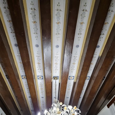 Nel caso di decorazioni più particolareggiate e complesse, ha applicato negli spazi tra le travi dei pannelli su misura precedentemente realizzati nel suo studio.